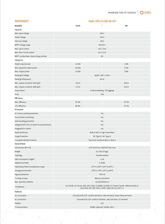 Efficient, reliable, and built for North American residential systems, the Solis-1P3.6K-4G-US offers up to 97.7 % efficiency in a compact, lightweight design. This inverter features dual MPPTs for flexible string configuration, integrated AFCI protection, and rapid shutdown capability for safety and code compliance.